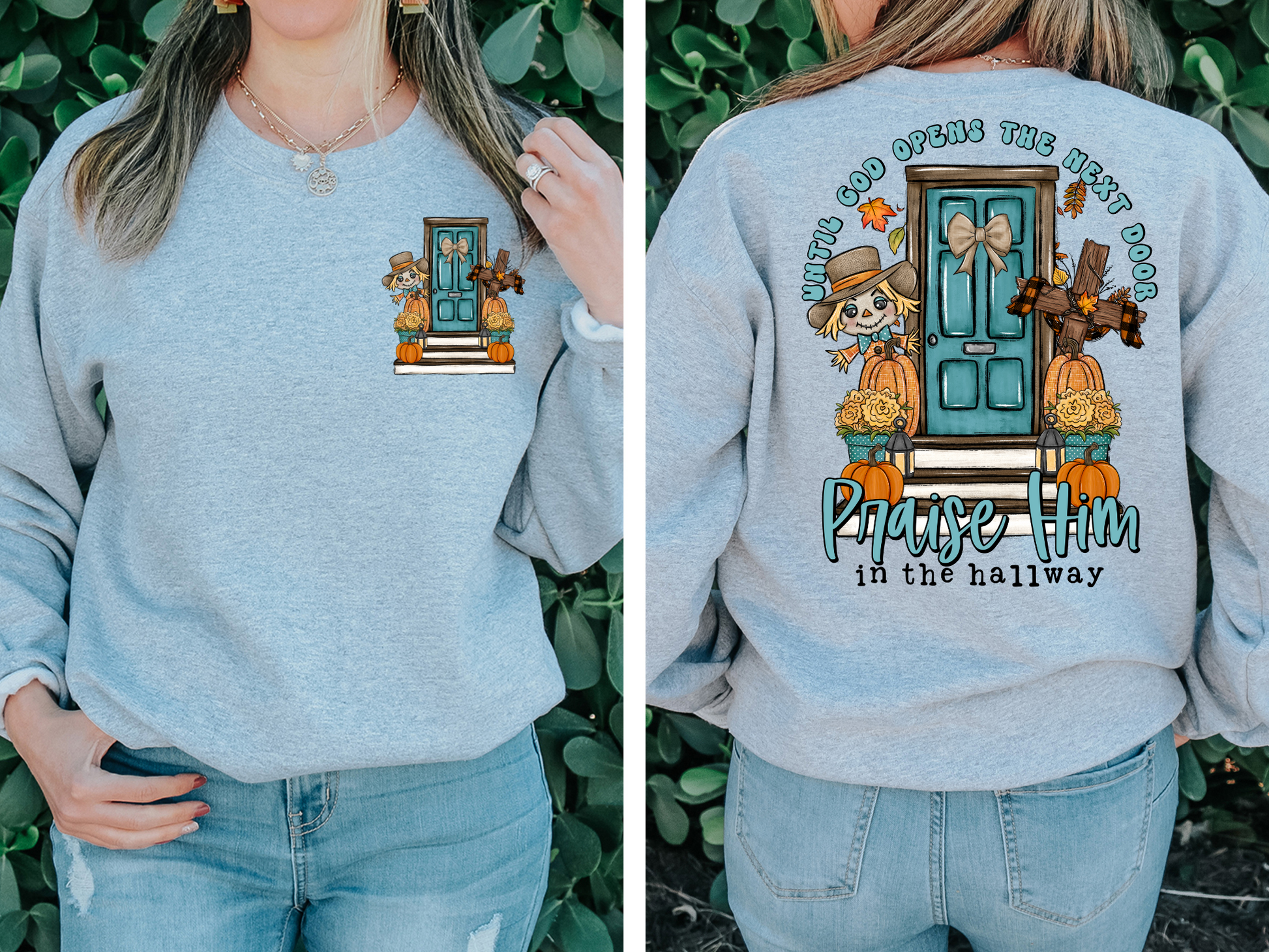 Blue door with fall decorations - front